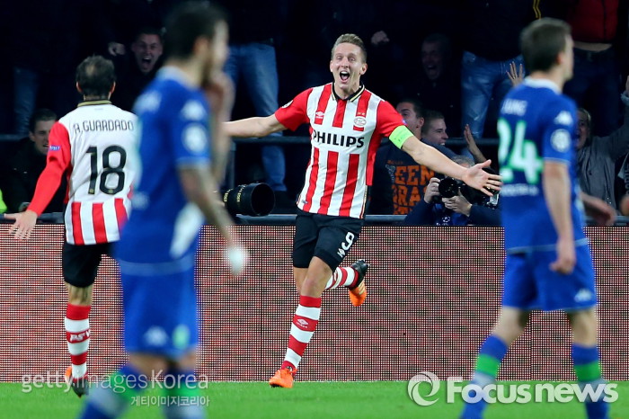 | △ <에인트호벤/네덜란드=게티/포커스뉴스> PSV 소속 루크 데 용(9번)이 10월4일 새벽(한국시간) 홈에서 열린 볼프스부르크와의 챔피언스리그 조별라운드 4차전에서 득점을 올린 뒤 환호하고 있다. (C)게티이미지/멀티비츠 |