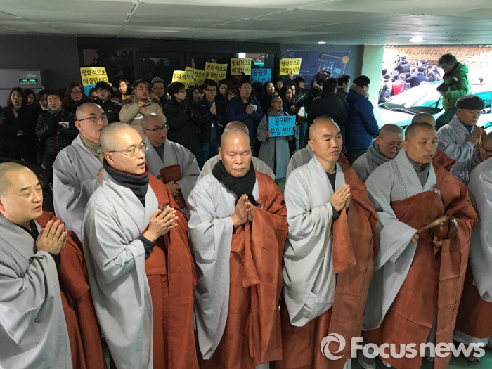 | △ 경찰투입 반대, 관음전 입구 막은 스님들 |