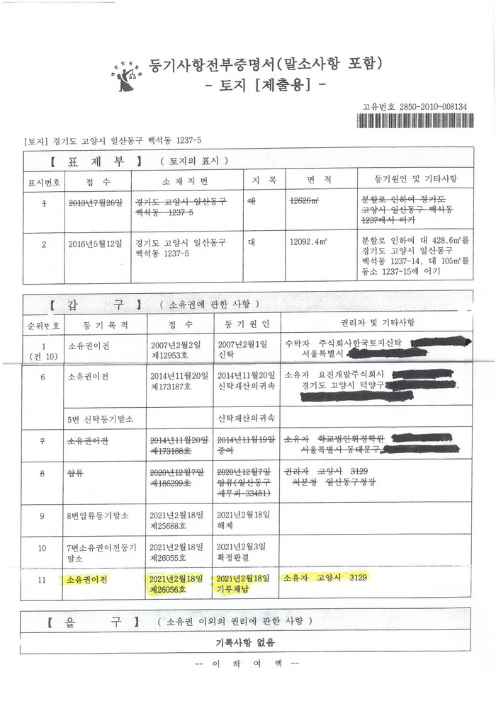 [부자동네타임즈 김인수기자] 고양시가 "관내 건설사인 요진개발과 5년간의 힘겨운 소송 끝에 마침내 지난 2021. 2. 23.자로 학교용지 12,092.4㎡에 대한 소유권이전등기를 완료했다."고 밝혔다.