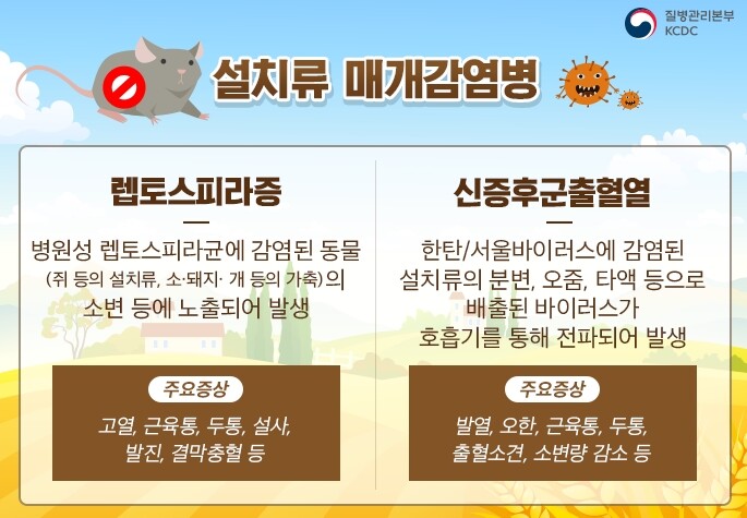 쥐 등의 설치류를 통해 전파되는 발열성 질환 중 가장 대표적인 감염병으로는 렙토스피라증과 신증후군출혈열이 있다. 렙토스피라증은 렙토스피라균에 감염된 동물의 소변에 오염된 물, 토양에 상처 부위가 닿으면 감염될 수 있다. 신증후군출혈열은 한타바이러스에 감염된 쥐의 분변, 타액 등으로 배출된 바이러스가 공중에 떠다니다 호흡기를 통해 사람에게 전파된다.