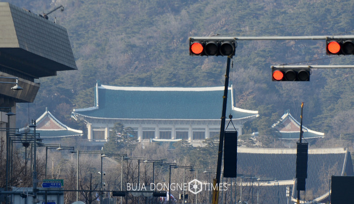 헌법재판소가 박근혜 전 대통령의 탄핵을 인용 결정한 10일 오후 서울 태평로에서 바라본 청와대 앞 신호등에 빨간불이 켜져있다. 2017.03.10.