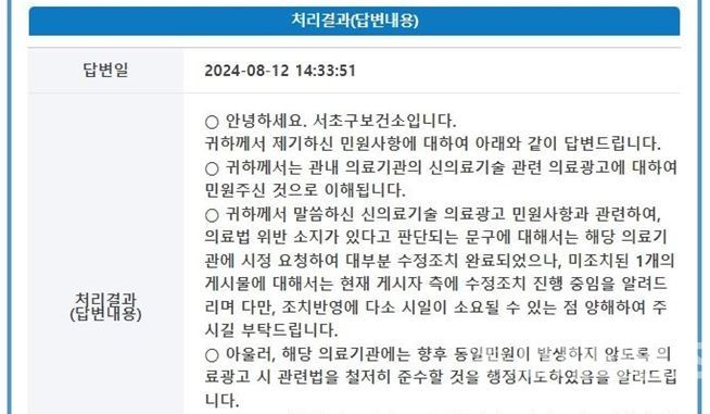 이에 대해 의료전문 법조인은 “광고 자체를 할 수 없는 제한적 의료기술을 광고한 것은 명백한 의료법 위반이고 정책의 주무 기관인 보건복지부도 의료법 위반에 해당되는 것으로 판단한 것에 대해 수사기관이 팔이 안으로 굽을 수밖에 없는 관련 민간 학회의 의견을 근거로 불송치 결정을 한 것은 납득하기 힘들다”라고 밝혔다.