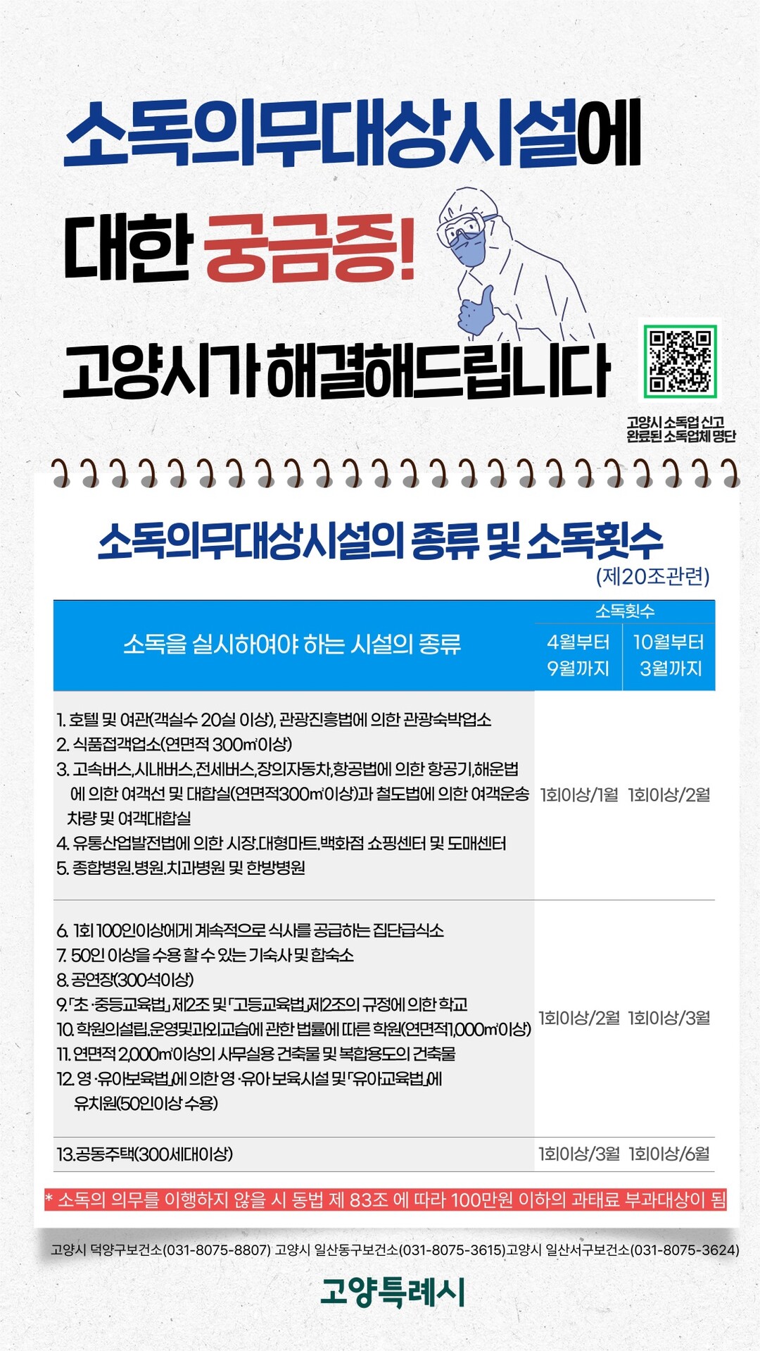 고양특례시 보건소는 향후 철저히 정기적인 소독실시 여부를 확인하고 주기적인 점검활동을 통해 소독의무대상시설이 법정 소독 횟수와 주기를 준수할 수 있도록 할 계획이다.