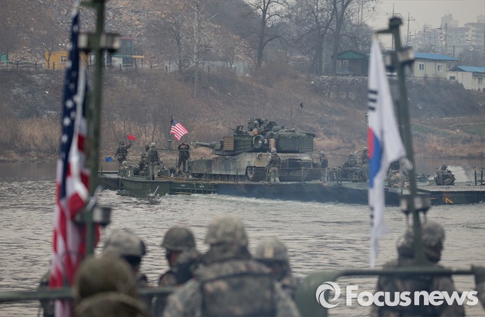 (연천=포커스뉴스) 10일 오전 경기도 연천군 한탄강에서 열린 '한·미 연합 도하훈련'에서 미군의 M1A2 SEP 전차가 부교를 이용해 도하하고 있다.