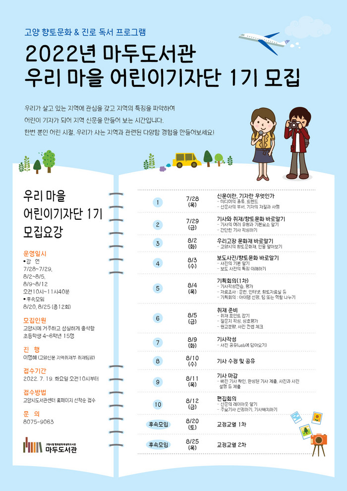 [부자동네타임즈 김인수기자] 고양특례시 마두도서관이 7월 28일(목) 마두도서관 강의실 및 향토문화자료실에서 초등 4~6학년을 대상으로 ‘우리 마을 어린이기자단’을 운영한다.