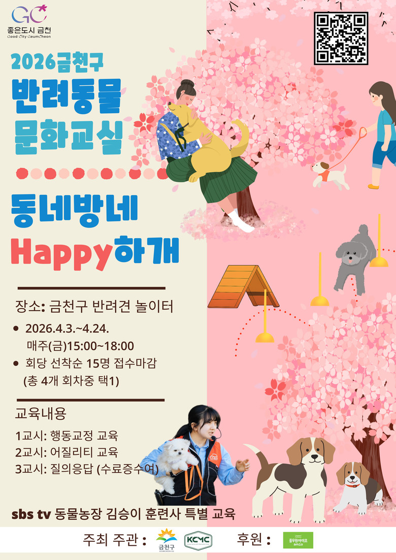 [부자동네타임즈=이의수 기자]금천구(구청장 유성훈)는 오는 4월 매주 금요일 반려인과 반려견을 대상으로 ‘동네방네 Happy하개(2026년 상반기 반려동물 문화교실)’ 프로그램을 운영한다고 밝혔다.