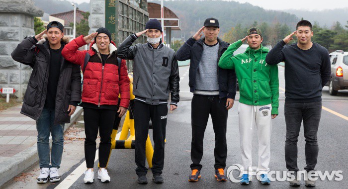 (세종=포커스뉴스) 왼쪽부터 황재균, 손아섭, 오재원, 차우찬, 김상수, 나성범이 23일 오후 세종시 장군면 32사단으로 입소하며 경례하고 있다. 프리미어12 국가대표 여섯 명은 2014 인천 아시안게임 야구대표로 금메달을 획득해 병역혜택을 받은 선수들로 4주간 기초군사훈련을 받는다.