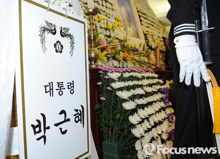 | △ 김영삼 전 대통령이 서거한 22일 오후 서울 종로구 서울대병원 장례식장에 마련된 고인의 빈소에 한아세안 정상회담에 참석한 박근혜 대통령이 보낸 근조화환이 놓여져 있다. <사진제공=포커스뉴스> |