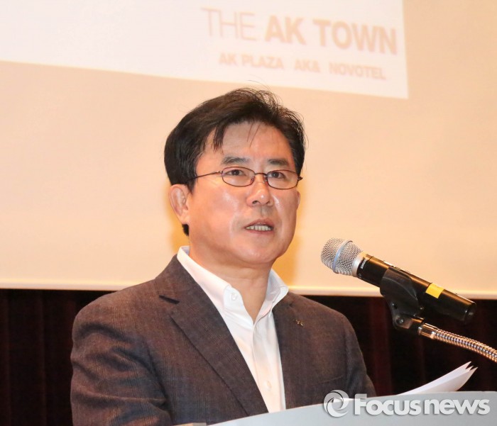 | △ 정일채 AK플라자 대표가 18일 AK플라자 수원점과 AK앤드(&), 노보텔 앰배서더 수원의 통합 명칭인 AK타운을 공식 선포하고 있다.<사진제공=AK> |