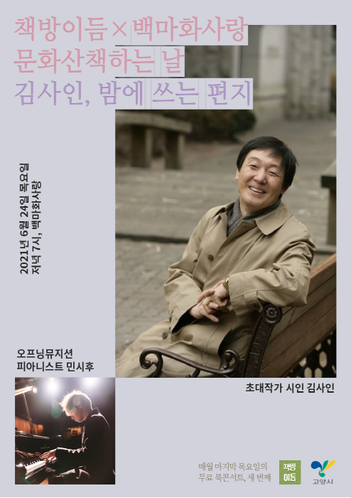 이 프로그램은 매월 마지막 주 목요일마다 고양 지역을 중심으로 한 다양한 장르의 예술가를 초청해 문화 공연 등을 펼치는 프로그램이다. 이번이 3번째 프로그램으로, 피아니스트 민시후와 김사인 시인이 출연한다.