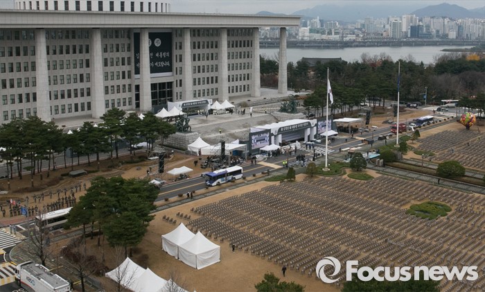 | △ 故 김영삼 전 대통령 영결식을 하루 앞둔 25일 오후 서울 여의도 국회 본청 앞에 영결식 무대 등이 설치되고 있다. <사진제공=포커스뉴스> |