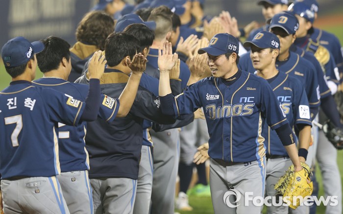 (서울=포커스뉴스) 21일 잠실구장에서 열린 프로야구 2015 포스트시즌 NC-두산 PO 3차전에서 승리한 NC 다이노스 선수들이 경기를 마치고 하이파이브를 하고 있다.