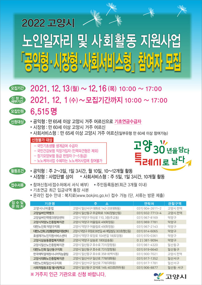 고양시는 2022년 노인일자리 및 사회활동지원 사업에 228억여 원을 투입, 모집인원을 올해 대비 441명 늘려 6,515명을 대상으로 한다. 경기도 31개 시·군 중 최다 모집인원으로 유형별로 나눠 모집한다.