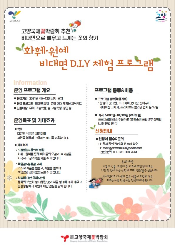 [부자동네타임즈 김인수기자] 재단법인 고양국제꽃박람회(이사장 이재준)가 "코로나19 상황 속에서 화훼 체험을 통한 꽃문화 확산, 감성 힐링을 위해 2021 비대면 화훼·원예 D.I.Y 체험 프로그램을 운영한다."고 밝혔다.