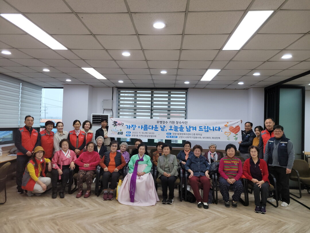 [부자동네타임즈 = 김인수 기자] 고양특례시 장항1동 지역사회보장협의체에서는 지난 16일 고양시 사회적기업봉사회(회장 박찬도)의 재능기부로 관내 65세 이상 어르신 31명을 대상으로 ‘효사랑 어르신 장수사진 무료촬영’을 진행했다.