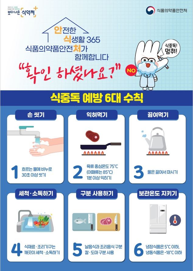 식중독을 예방하기 위해서는 ▲흐르는 물에 30초 이상 손 씻기 ▲음식물은 익혀서 먹고 물은 반드시 끓여 마시기 ▲날 음식과 조리음식 구분하여 칼, 도마 사용하기 ▲냉장식품은 5℃이하, 냉동식품은 –18℃이하에서 보관하기 등 식중독 예방 6대 수칙을 반드시 지켜야 한다.