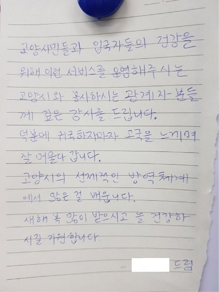 고양시민으로서 자부심을 느꼈습니다. 남은 기간도 자가격리 잘 임하겠습니다. 모두 건강하세요, 고양시 최고 젊은 여성이 쓴 정갈한 쪽지도 눈에 띈다.