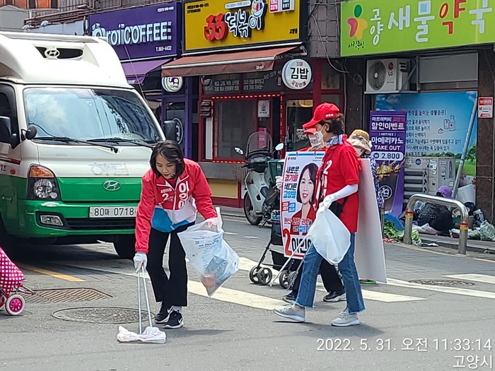 이인애 후보는 지난 23일부터 선거운동원들과 함께 시민들이 많이 이용하는 원신, 고양, 관산동 거리 주변 일대를 청소해왔다.