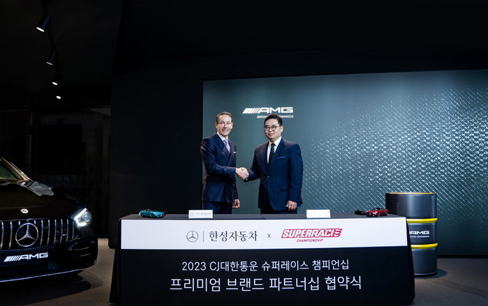 슈퍼레이스와 한성자동차가 19일 서울 방배동에 위치한 한성자동차 AMG 퍼포먼스 센터에서 프리미엄 브랜드 파트너십 협약식을 진행했다. 양 사의 협약에 따라 한성자동차는 슈퍼레이스에서 가상 광고, 대형 배너, 그리드 배너 등을 통해 팬들과 만난다.