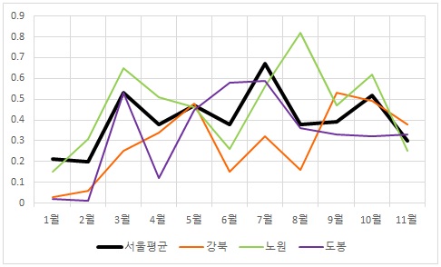 | △ 서울 노도강(노원·도봉·강북) 지역 아파트 매매 월간 변동률 추이(%). <자료출처=부동산114> |