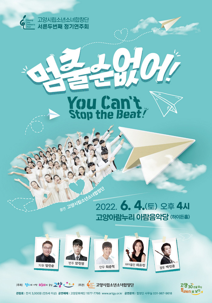 [부자동네타임즈 김인수기자] 푸른 녹음이 시작되는 6월, 고양시 대표 청소년 문화사절단인 고양시립소년소녀합창단이 제32회 정기연주회 멈출 순 없어! You can’t stop the beat!를 오는 6월 4일(토) 오후 4시 아람음악당 하이든 홀에서 개최한다.