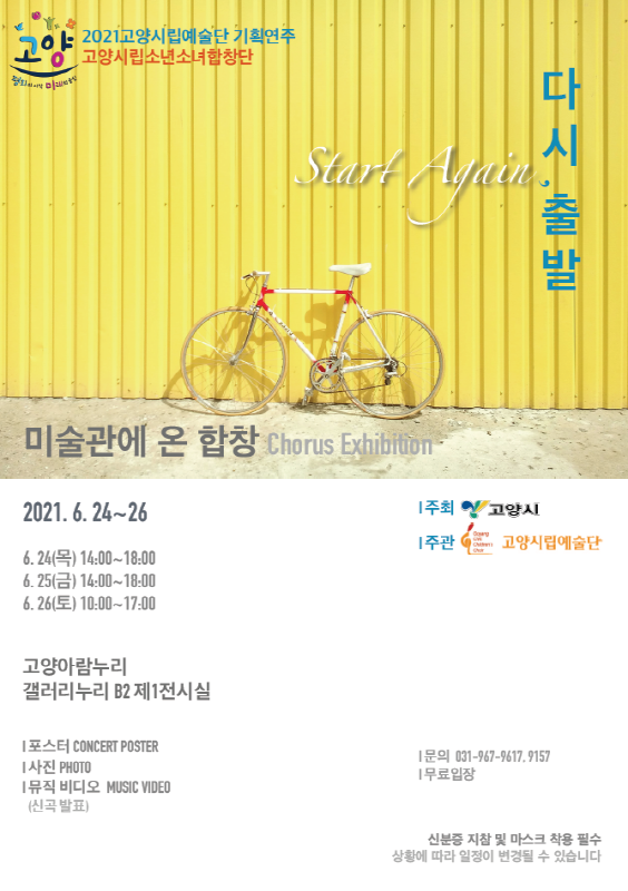 [부자동네타임즈 김인수기자] 고양시는 6월 24일부터 26일까지 고양시립소년소녀합창단의 음악 전시회 ‘미술관에 온 합창: 다시 출발’을 고양아람누리 갤러리누리(제1전시실)에서 개최한다.