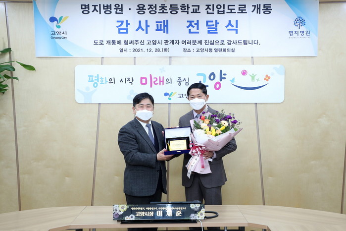 [부자동네타임즈 김인수기자] 고양시가 호국로에서 명지병원을 직접 연결하는 진입도로를 개설한 것에 대한 감사 표시로 명지병원으로부터 감사패를 전달받고 지난 28일 전달식을 개최했다.