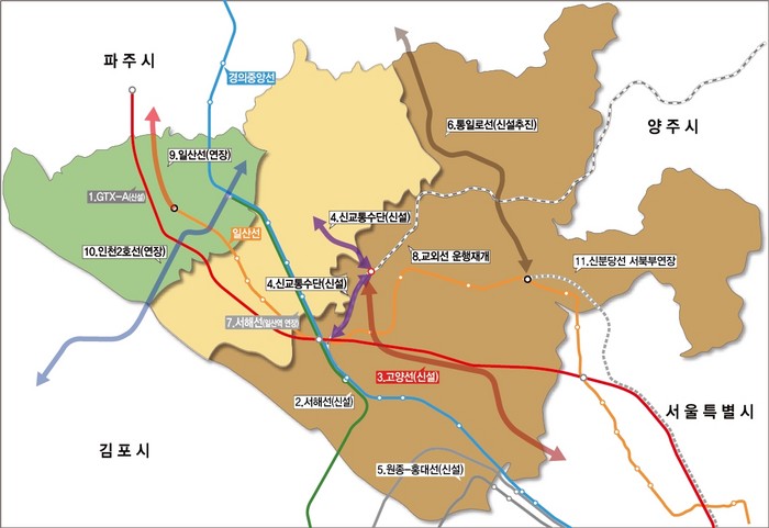 고양시는 철도교통망 확충을 위해 GTX-A·서해선 등 6개 철도 노선 신설과 지하철 3호선(일산선)·인천2호선 등 5개 노선 연장을 추진하고 있다고 6일 밝혔다.