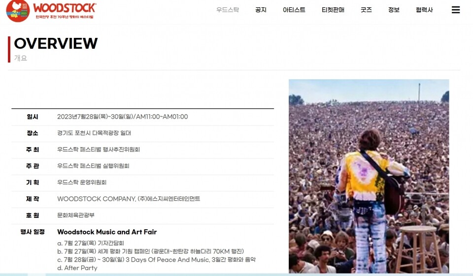 [사진설명] 우드스톡 페스티벌 공연기획사가 홈페이지네 문화체육관광부 후줭 무단으로 사용해 논란 / 우드스톡 홈페이지 캡쳐.