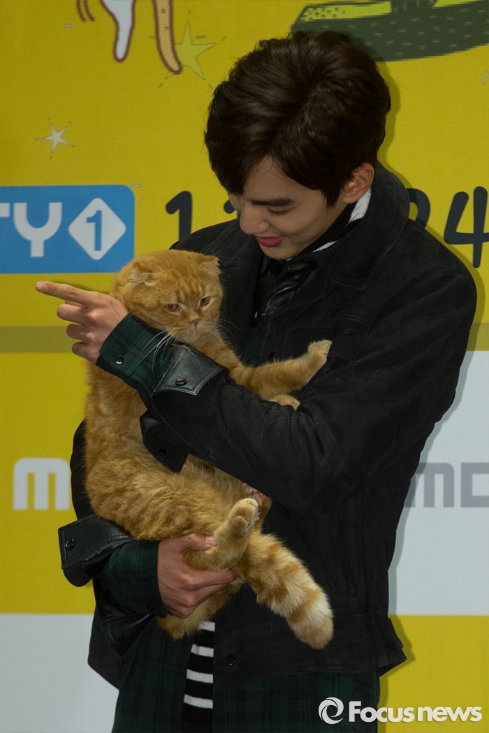 (서울=포커스뉴스) 24일 오후 서울 영등포구 여의도 CGV에서 열린 MBC every1 드라마 '상상 고양이' 제작발표회에 참석한 배우 유승호가 극중 '복길이' 역을 맡은 고양이와 포토타임을 갖고 있다.