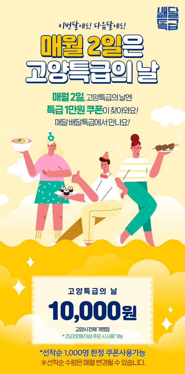 12월 이벤트로는 크리스마스를 맞이하여 릴레이 쿠폰 지급 이벤트(12/22~12/28), 신규가입 이벤트(12/1~12/25, 500명 대상 10,000원 쿠폰 지급), 배달비 지원 이벤트(12/1~12/31, 3,000명 대상 3,000원 쿠폰 지급), 고양 특급의 날 이벤트(매월 2일 1,000명 대상 10,000원 쿠폰 지급)가 진행된다.