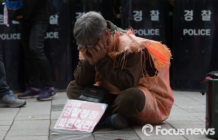 (서울=포커스뉴스) 16일 오후 서울 서대문 경찰청 앞에서 전국농민회총연맹을 비롯한 기타 농민 단체들이 "백남기 농민 살인 진압, 강신명 경찰총장 파면" 농민 기자회견을 열었다. 한 농민이 슬픔에 잠겨 있다.