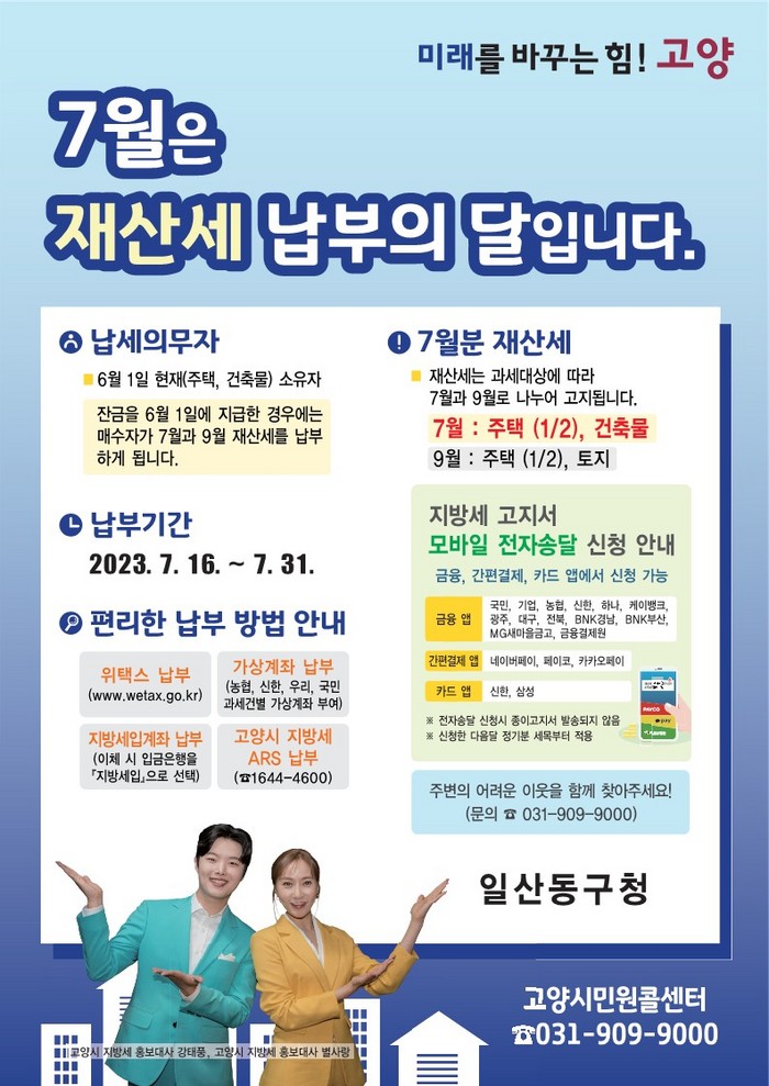 [부자동네타임즈 김인수기자] 고양특례시 일산동구는 2023년 7월 정기분 재산세 459억 원을 부과했다고 14일 밝혔다.