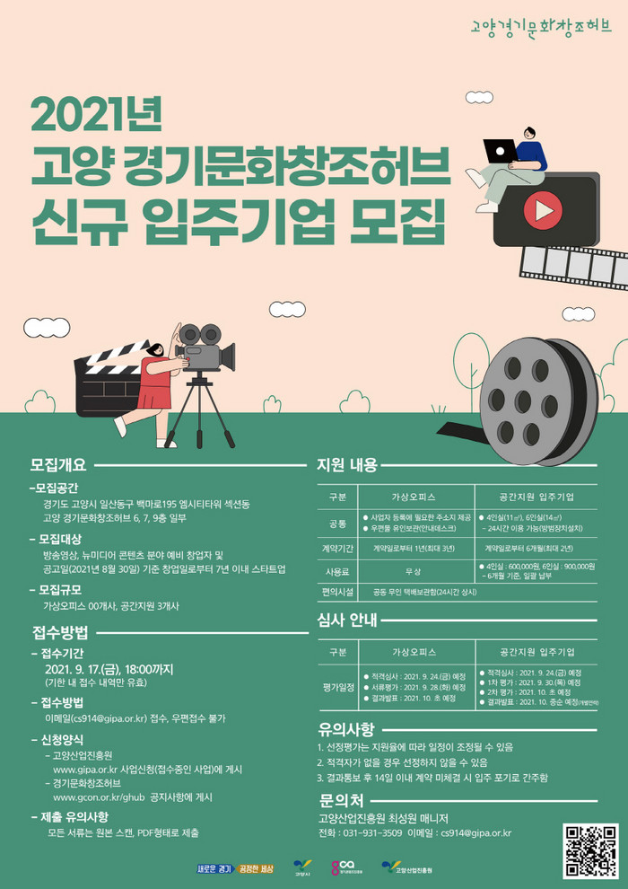 [부자동네타임즈 김인수기자] 고양시, 고양산업진흥원(원장 오창희)이 운영하는 고양 경기문화창조허브에서 오는 17일까지 신규 입주기업을 모집한다.