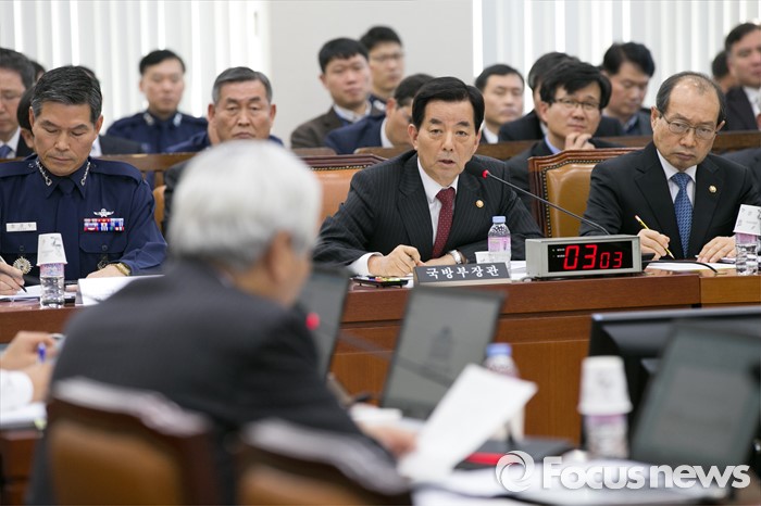(서울=포커스뉴스) 한민구(가운데) 국방부 장관이 17일 오후 서울 여의도 국회 국방위원회 전체회의실에서 열린 한국형 전투기(KF-X) 사업 관련 공청회 및 논의에 출석해 의원질의에 답변하고 있다.