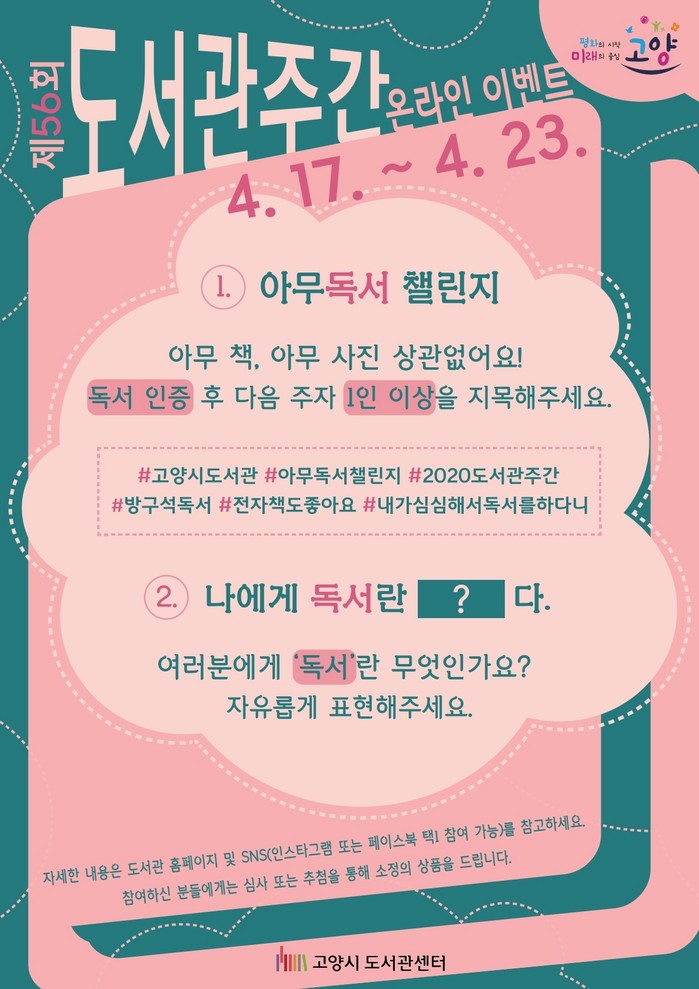 ‘아무독서 챌린지’ 이벤트는 인스타그램 또는 페이스북 중 하나를 선택해 책표지, 인상 깊은 페이지 등을 올려 독서를 인증하는 이벤트다. 아무 사진을 #고양시도서관 #아무독서챌린지 #2020도서관주간 #책제목 필수 해시태그와 함께 올리며, 다음주자 1인 이상을 지목하는 이벤트로 하루에 한 번, 7일간 7회까지 참여할 수 있다.