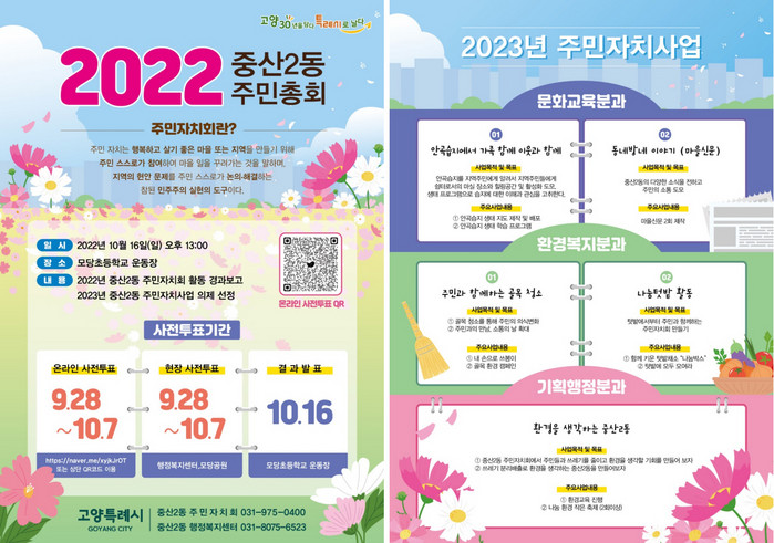 박응상 중산2동 주민자치회장은 “지난 7월부터 주민 설문조사를 시작으로 지역 현안 과제를 발굴하고, 내년도 사업 선정을 위해 주민투표를 진행했다. 참여해주신 주민여러분께 감사드리며, 총회에서 그 결과를 같이 공유하는 자리에 참석해 주시길 바란다. 또한 오랜만에 개최되는 축제도 즐거운 마음으로 참석하셔서 아름다운 가을날 우리 마을에 대한 좋은 추억을 만들 수 있길 바란다.”고 전했다.