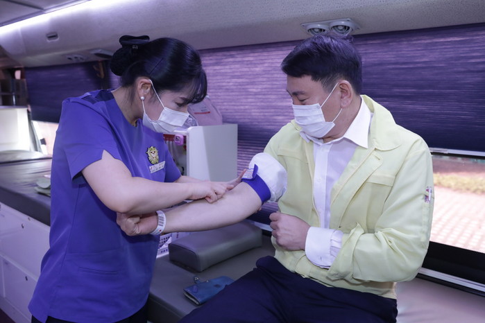 코로나19에 따른 혈액 수급난 해소를 위해 일산서구 직원들은 23일 오전 청사 광장에 마련된 2대의 대한적십자사 헌혈 버스에서 헌혈을 했다.
