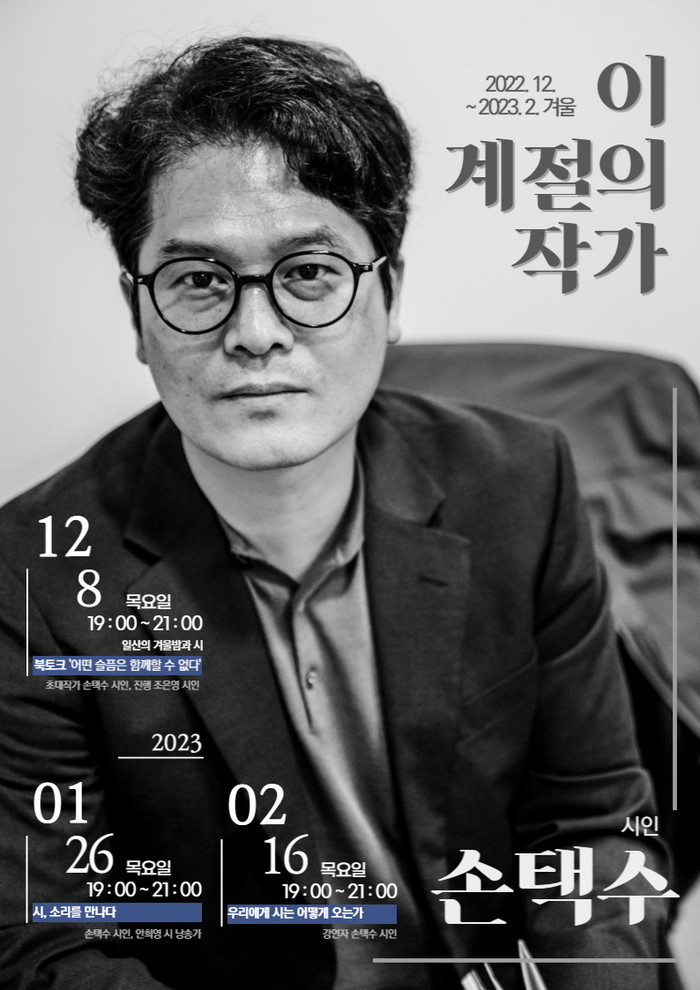 [부자동네타임즈 김인수기자] 고양특례시(이동환 시장) 아람누리도서관이 ‘이 계절의 작가’ 프로그램 겨울의 작가로 선정된 손택수 시인의 시 낭송회를 오는 1월 26일 목요일 저녁에 운영한다.