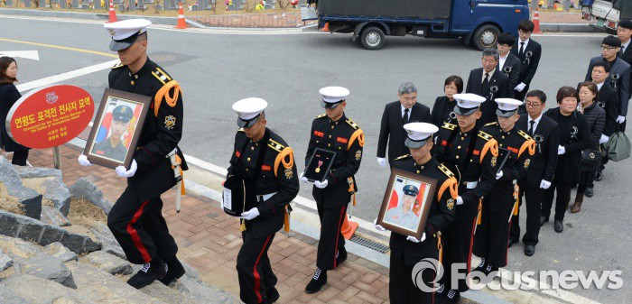 (대전=포커스뉴스) 16일 오전 대전 유성구 국립대전현충원에서 열린 연평도 포격도발 전사자 안장식에서 故 서정우 하사와 故 문광욱 일병의 영정과 영현이 묘역으로 봉송되고 있다. 연평도 포격도발 전사자 합동묘역은 제2연평해전 전사 6용사 합동묘역 옆에 조성됐다.