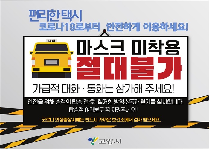 이에 고양시는 타 지역으로 출‧퇴근 하는 시민 등 대중교통을 이용하는 시민들에게 경각심 갖도록 유도하고 마스크 필수 착용 등 보다 엄격한 방역지침 준수를 안내하기 위해 ‘대중교통 방역지침 준수’ 홍보 스티커를 제작해, 지난 8일부터 버스, 택시 등 관내 모든 대중교통 차량에 배부했다.