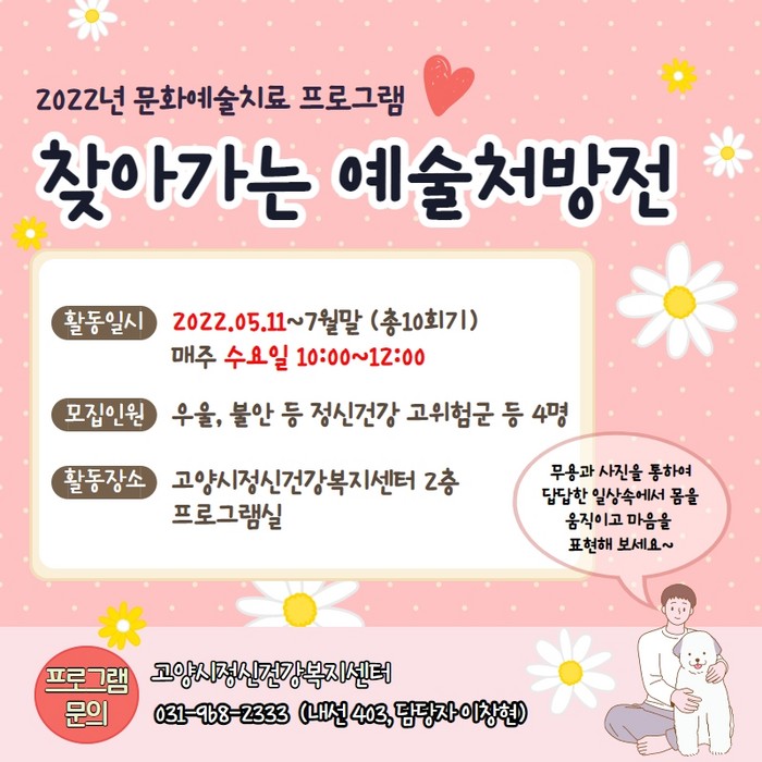 [부자동네타임즈 김인수기자] 고양시정신건강복지센터가 2022년 찾아가는 예술처방전 ‘나는 예술꽃이로다’를 운영한다. 센터는 1차 프로그램을 5월 11일부터 7월 20일까지 운영한다고 밝혔다.
