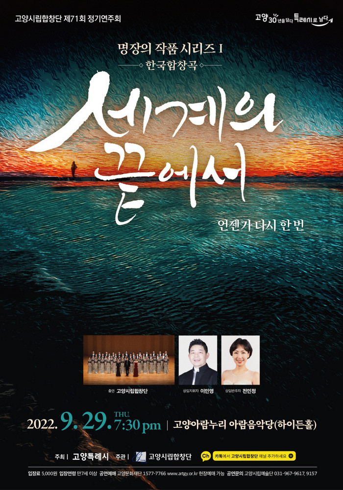[부자동네타임즈 김인수기자] 가을의 정취가 물씬 느껴지는 9월의 마지막 주, 지친 마음을 달래고 영혼을 살찌우는 시간을 선사하기 위해 고양시립합창단이 제71회 정기연주회 『세계의 끝에서 – 언젠가 다시 한번』을 오는 9월 29일(목) 고양아람누리 아람음악당(하이든홀)에서 개최한다.