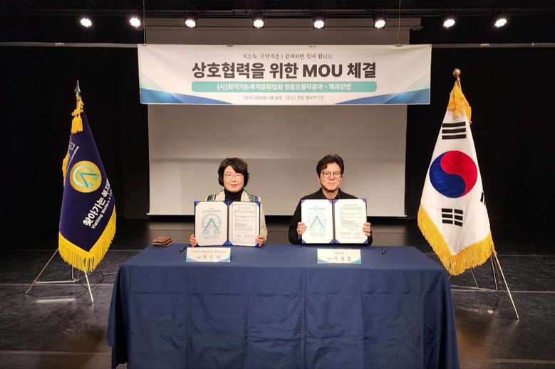 | ▲ ㈔찾아가는 복지문화협회 영등포동작분과와 ‘책과 강연’이 공동 주최한 행사에서 책과 강연(대표 이정훈)과 (사)찾아가는 복지문화협회 관계자들이 상호 협력을 위한 MOU(업무협약)를 체결하고 있다. [사진 제공 = ㈔찾아가는 복지문화협회 영등포동작분과] |