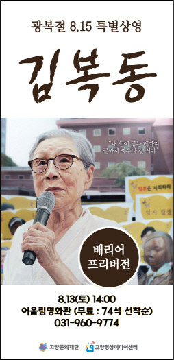 [부자동네타임즈 김인수기자] 고양특례시(시장 이동환) 산하 고양문화재단(대표이사 정재왈) 고양영상미디어센터에서 지원하여 제작한 배리어프리버전 영화 <김복동>이 광복절과 위안부 기림의 날을 맞아 8월 13일(토) 무료로 상영된다.