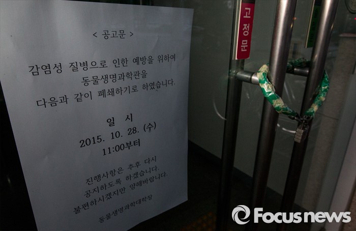 | △ 28일 오후 서울 광진구 능동로 건국대학교 동물생명과학대학 건물에서 원인을 알 수 없는 질병이 발병해 건물 한 개 동이 폐쇄됐다. 건물 입구에 폐쇄를 알리는 안내문이 부착돼 있다. 양지웅 기자 yangdoo@focus.kr |