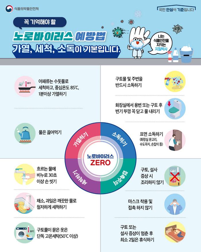 한편 노로바이러스 식중독은 오염된 음식물이나 물을 섭취하거나 감염된 환자와의 접촉을 통해 발생하는 감염병이다. 11월에서 2월 사이 겨울철에 집중 발생하며 바이러스에 감염되면 1~2일 안에 구토, 설사 등의 증상이 나타난다. 그 외 복통, 오한, 발열이 나타나기도 한다.