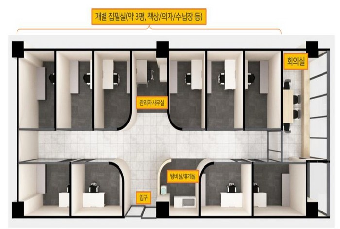 경기도가 지원하고 경기콘텐츠진흥원이 운영하는 ‘경기스토리작가하우스’는 시나리오 창작자를 발굴‧육성하기 위한 사업이다. 전용면적 167.9㎡(51평) 규모로 작가 개별 집필 공간 10실, 회의실, 사무공간 등이 구성됐다.