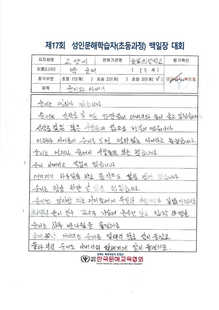 우수상을 수상한 박순애 학습자는 “내 인생에 글을 써서 이렇게 기뻐할 줄은 생각지도 못했습니다. 항상 따뜻하게 공부의 길을 열어주시는 고양시와 선생님께 감사드립니다”라고 소감을 밝혔다.