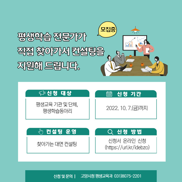[부자동네타임즈 김인수기자] 고양특례시(시장 이동환)가 고양시 소재 평생교육기관 및 단체, 평생 학습동아리를 대상으로 2022년 고양시 평생학습 컨설팅을 추진한다.